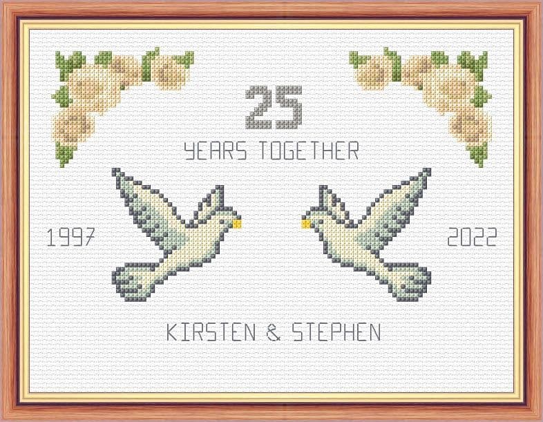 Doves + Roses: 25th, Silver Grey Wedding Anniversary, 14 Count Cross Stitch Sampler Kit